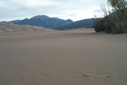 2002 08 13 Great Sand Dunes NP, San Luis Valley COI spent all of today either at the Great Sand Dunes or out looking around in the (very large and very flat) San Luis Valley. The morning was a bust photographically speaking. I got up at 5:30 and had hiked out to be where I wanted to be by 6:45 or so. (Sunrise here is about 6:20, but the sun does not come up over the Sangre de Cristo mountains to the east until about 7:00. Nice gory name for those mountains, eh? The "Blood of Christ" mountains. Those Spaniards could pick em..) Anyway, I am out there, and all we have overhead are nice high gray clouds. Not completely overcast, but enough to kill the light and make the whole thing a washout. I wandered around perhaps thinking that the clouds might vaporize, but that did not happen.. did not shoot a frame. But I did take a few snaps. This is more or less what the dunes look like at that hour: