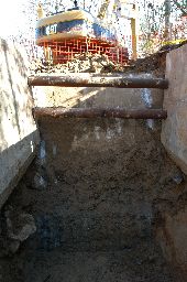2004 12 22So, this week we ran into our first complication. Some of you may already know that 50-60 years ago there was an artificial pond on our property, formed by a concrete dam. This dam is now buried and runs under the front deck of the house and is under a bit of the front (river side) of the house itself. An enormous amount of concrete rubble and "engineered fill" went into the pond before the first house on the property was built, and the same happened again when the current house (ours) was built 9-10 years ago. When the existing 24" concrete pipe was put in along Charmian Road it was cut through the top 6-7 feet of this dam. I knew about this and the engineer and contractor were made aware of the existence of the dam. What we were not aware of was the size of the dam. This week we found out. It's 15-16 feet tall, about 18-20 in thick at the top, and perhaps 6-7-8 feet thick at the bottom. It's big. The new 60" concrete pipe has to go through this dam considerably lower in the ground than the existing 24" inch pipe. This was known at the outset, and a "time and materials" contingency clause was put in the bid to cover concrete cutting. That's where we are now. Concrete cutting will commence Monday. You might be wondering how you cut concrete that is several feet thick. It's done with what looks like a very thick (1/4 to 3/8 in.) piece of wire that has industrial diamond coated beads on it spaced about 3 in. apart. A hole is drilled though the concrete, the wire is threaded through, and then threaded onto a series of what look like pulleys that maintain the tension in the wire as it is forced sideways through the concrete. It will take 2-3 days to make either 2 or 3 cuts in the dam, and then the free piece will be knocked over and hammered apart. It's not being hammered apart in place to keep the vibration from being transmitted into our house or the neighbors. I have learned that concrete weighs about 150 lbs per cubic foot, and that about 300 square feet of cutting can be done with one of these wires before it's used up. All of the rubble will be "lost" in the trench for the new pipe. (I am including this link simply because it mentions the "Mega Demo" at the "World of Concrete" convention, both of which are superb names. I'd love to go to the "World of Concrete" convention.) Here are a couple of snaps of the pipe that has been laid so far, and the dam. First, a snap of the old pipe headwall, the new pipe (no headwall yet) and the temporary black plastic pipe used to keep the water out of the way. The face of the dam. What looks like a crack about an inch up from the bottom of the photo is the bottom of the dam. The top of the dam. I can hardly resist saying "Dam. This is fun." |